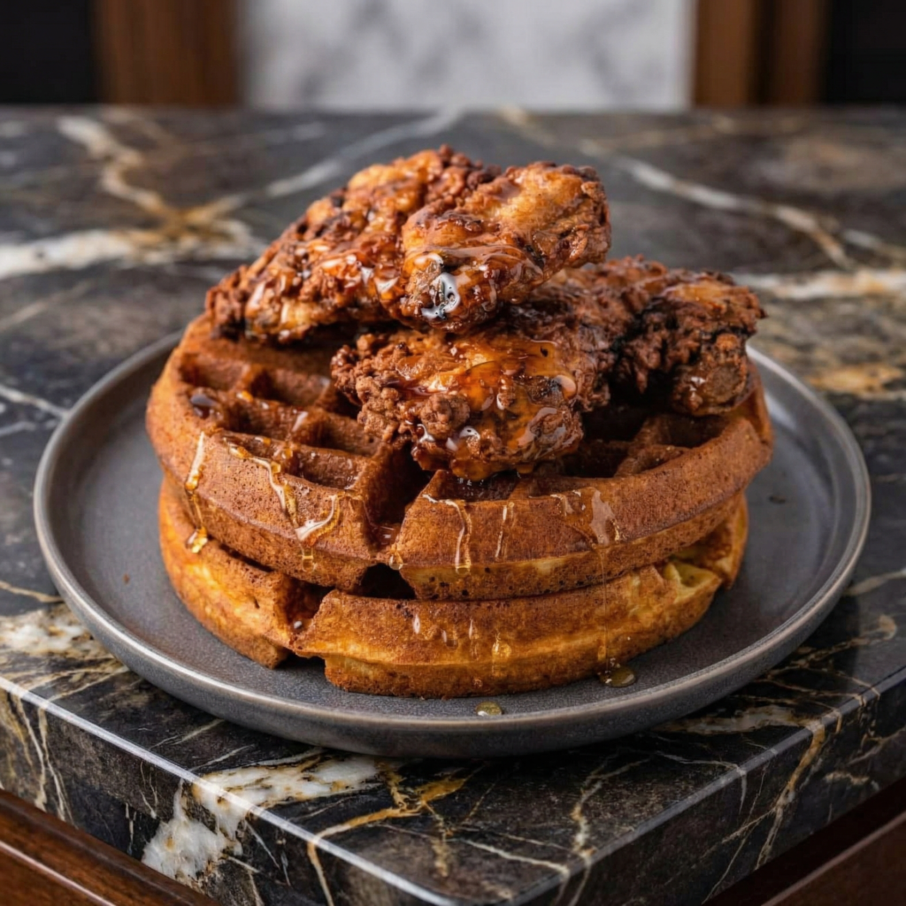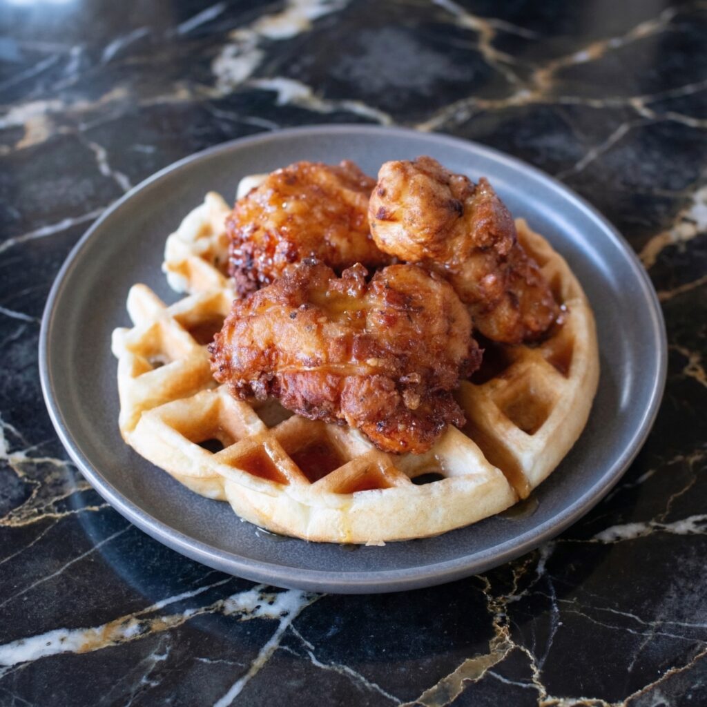 Chicken and waffles is the kind of dish that makes you question why we ever decided to separate breakfast and dinner. On one side: crispy, juicy fried chicken with a seasoned crust that shatters when you bite into it. On the other: a light, fluffy waffle with crisp edges, ready to catch every drop of maple syrup.