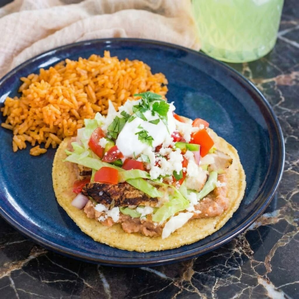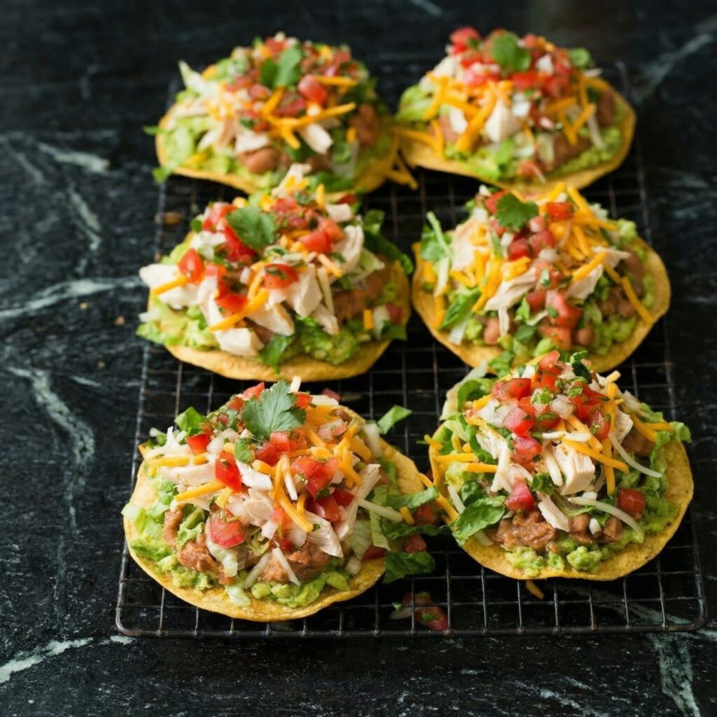 Reheat chicken in a skillet or microwave. Warm beans on the stovetop or microwave. Never assemble tostadas ahead—soggy shells are sad shells.