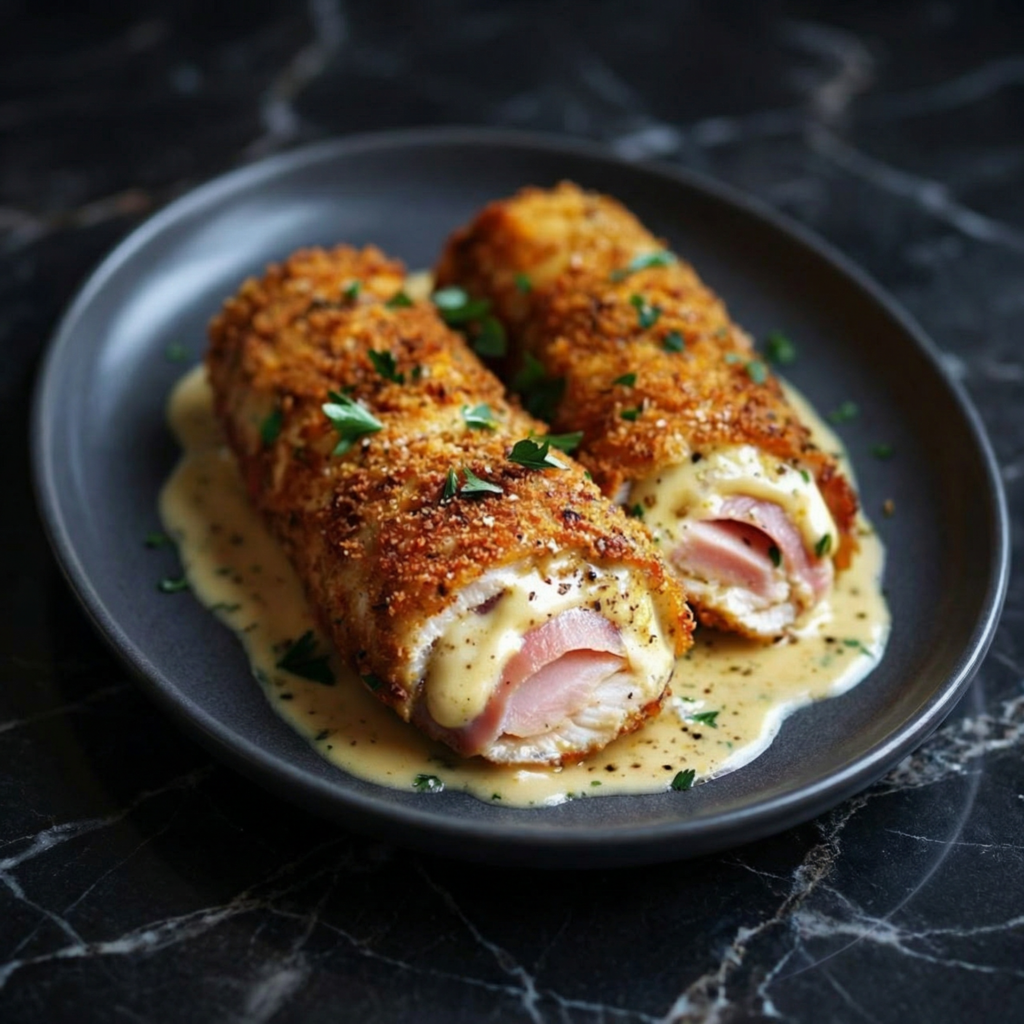 This classic recipe features tender chicken breasts stuffed with savory ham and melted cheese, then breaded and baked (or fried) until golden and crisp. Slice into it, and you’re rewarded with a gooey, cheesy center wrapped in juicy chicken and a crunchy crust.