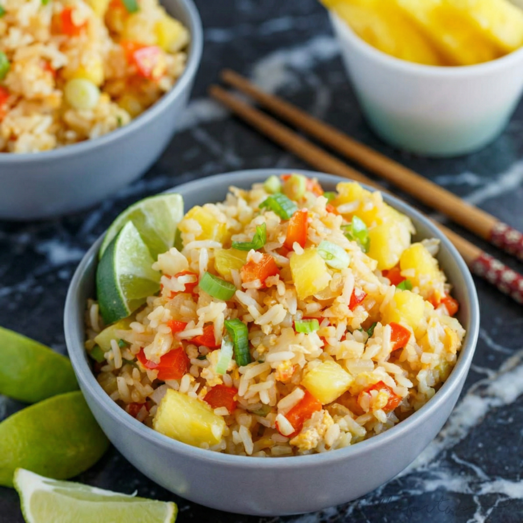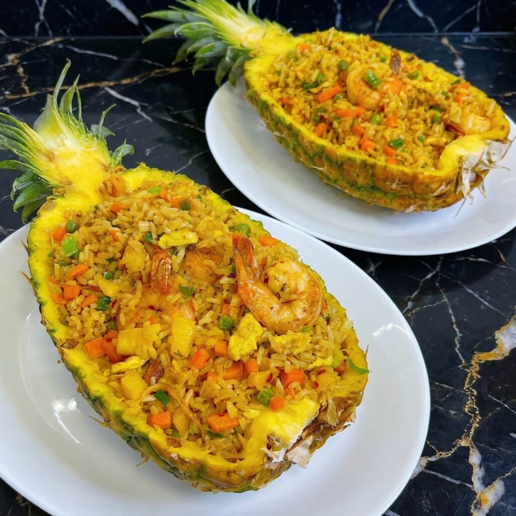Pineapple fried rice is what happens when savory meets sweet and they decide to throw a party. Fragrant jasmine rice, wok-tossed with juicy chunks of pineapple, plump shrimp, crunchy cashews, and a whisper of curry powder—all served in a hollowed-out pineapple that doubles as the coolest bowl you’ll ever eat from.