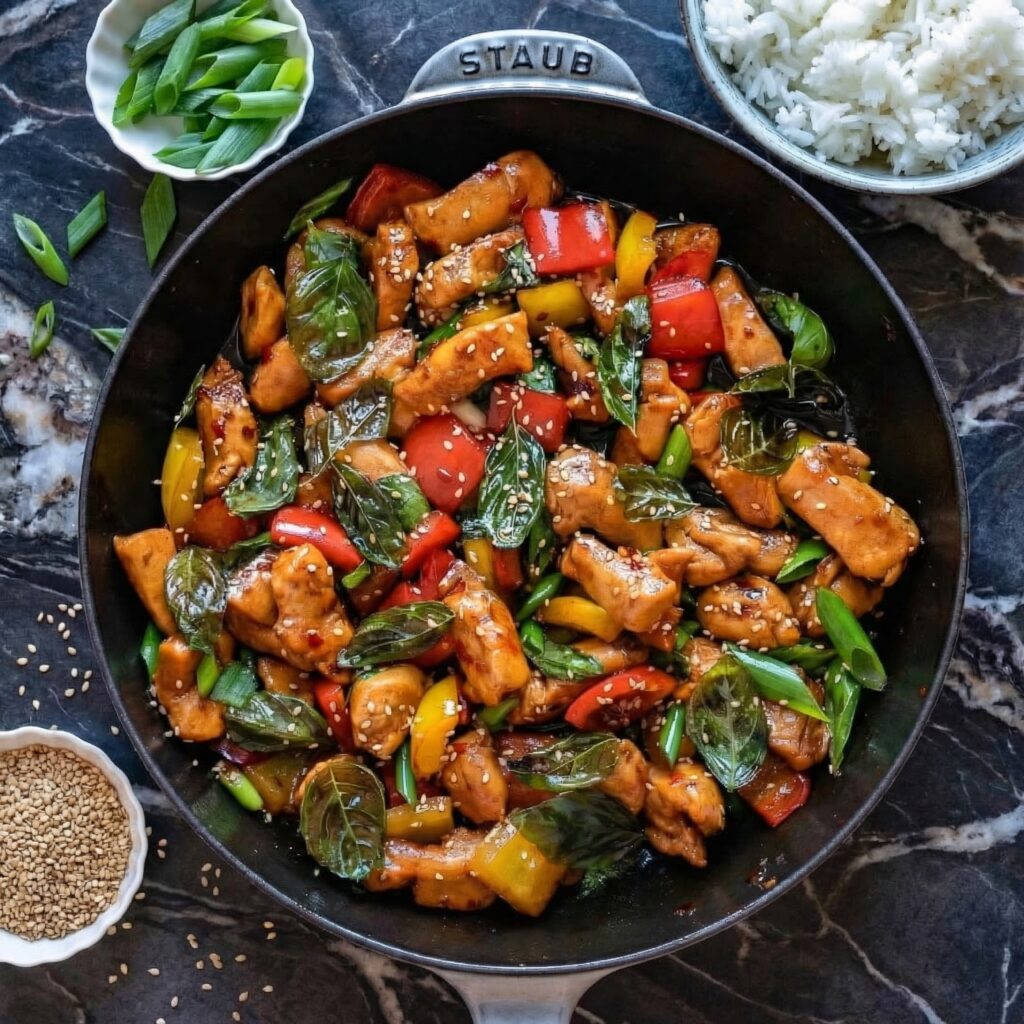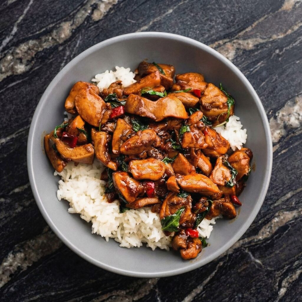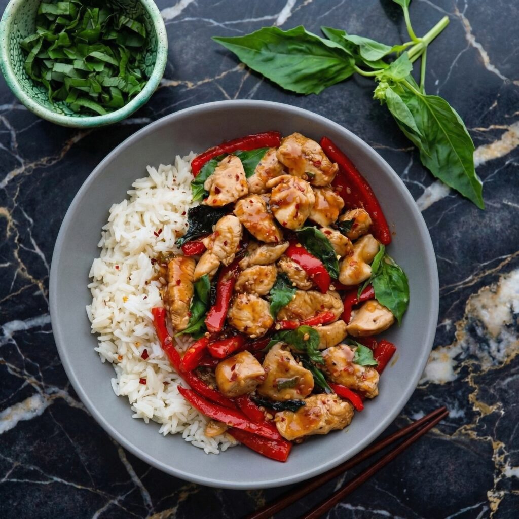 - Scoop jasmine rice into bowls. Top with the Thai basil chicken.