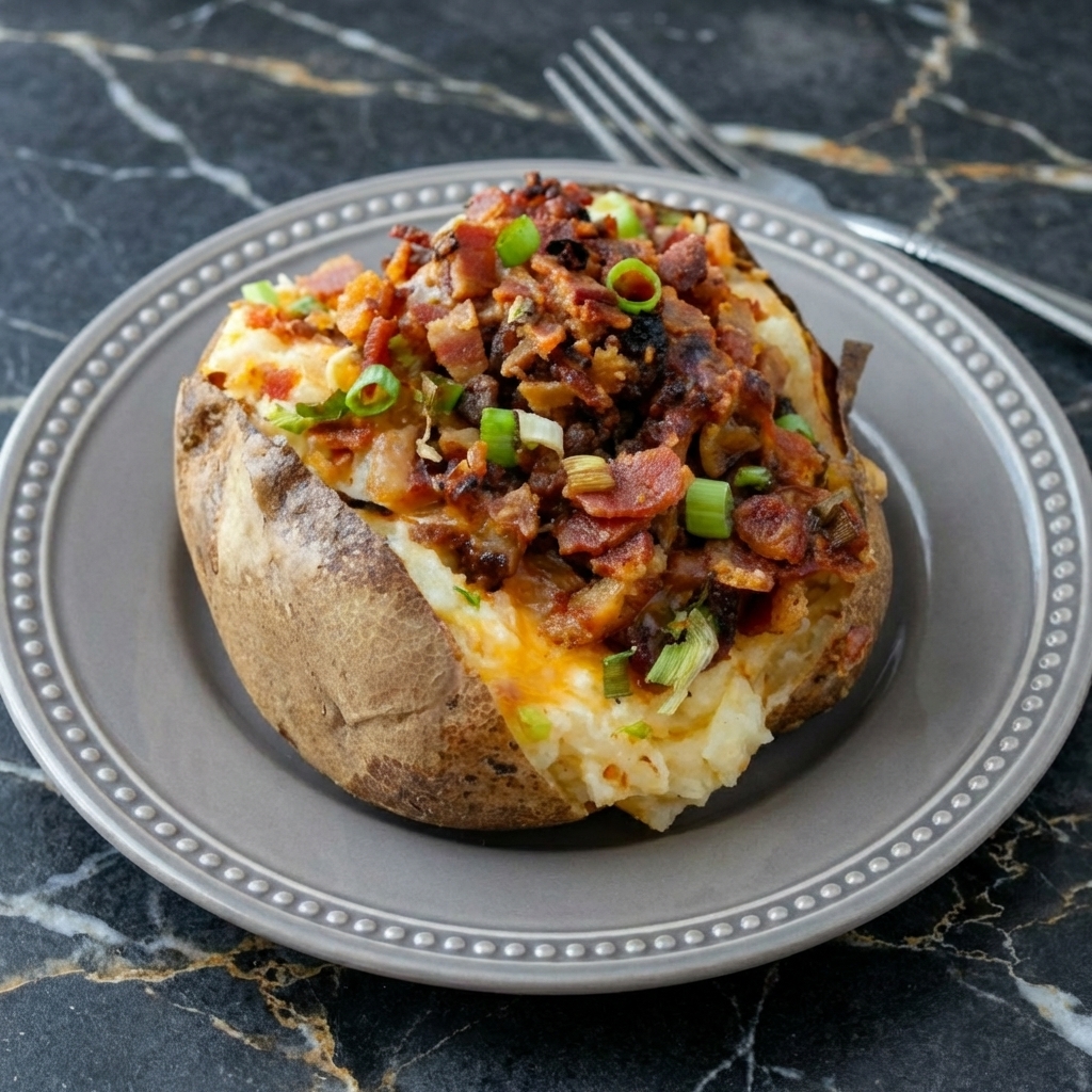 The baked potato is humble. The loaded baked potato? That’s a star. A perfectly baked potato with a crispy, salty skin and a fluffy, steam-in-the-oven interior, split open and stuffed with all the good stuff—melty cheddar, crispy bacon, cool sour cream, and fresh chives.